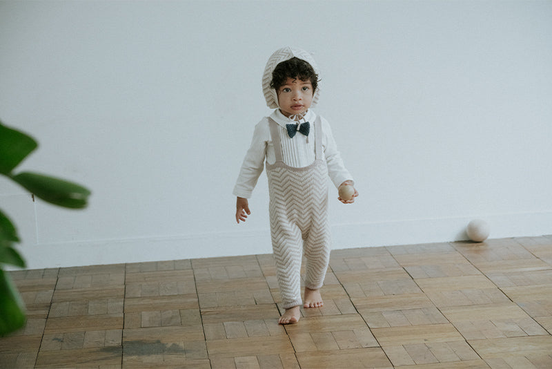 這款日本製針織褲運用 WHOLEGARMENT 無縫技術,完美貼合寶寶身形,打造極致舒適穿著體驗。專為充滿探索精神的小勇士設計,搭配可調式肩帶,靈活適應 70~80cm 身高,從午睡到爬行都自在自如。鋸齒形圖案靈感源自傳統山路,象牙白與粉紅色調巧妙融合,展現獨特個性與優雅。寒冬出遊可搭針織外套或無簷帽,輕鬆打造時尚又實用的探險裝備。讓寶寶穿出態度,勇敢迎接每一步新挑戰。