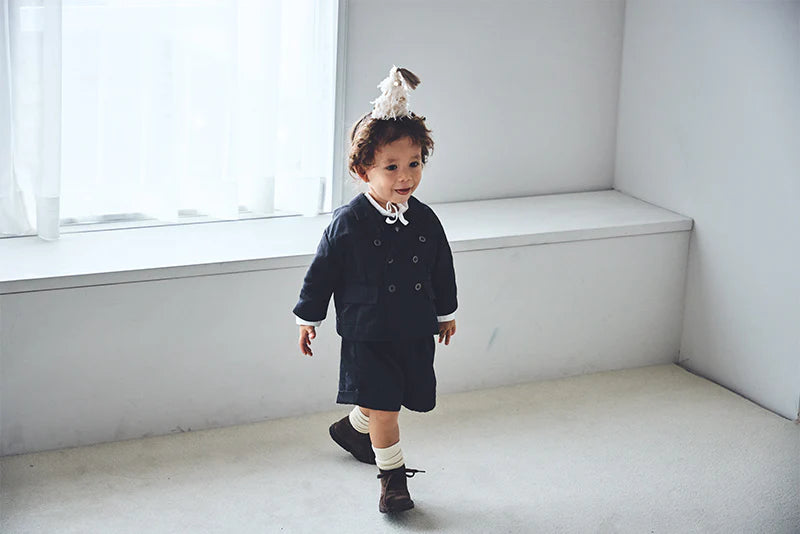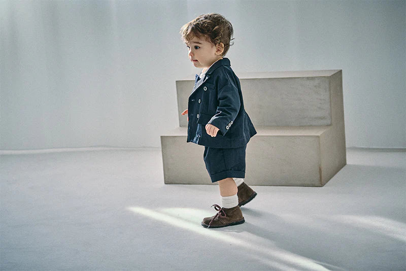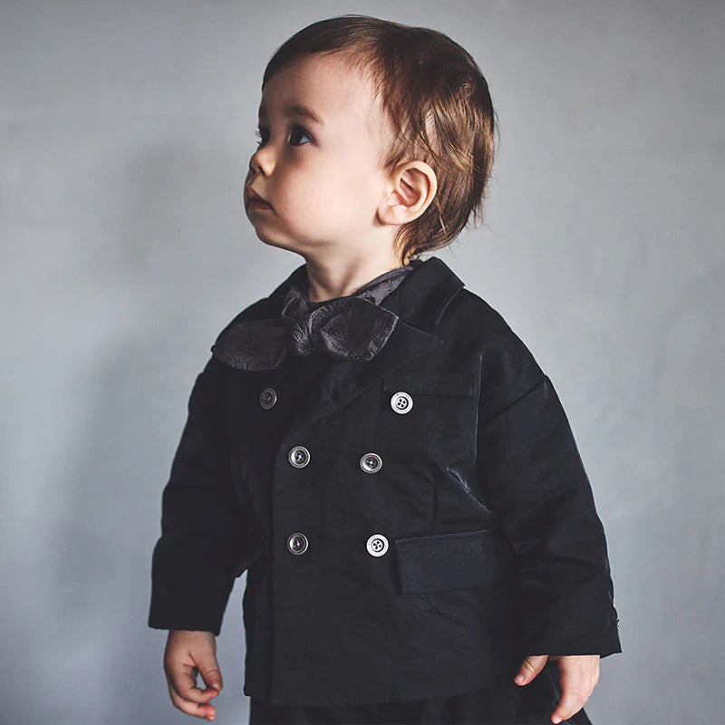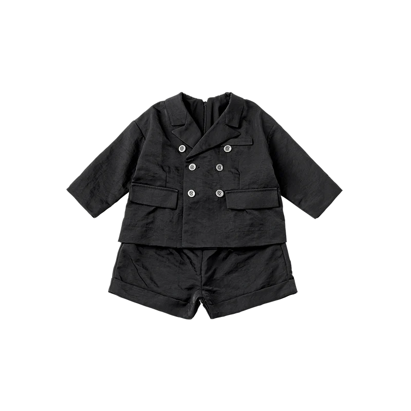缺口翻領和雙排扣設計靈感來自經典夾克,讓寶寶看起來像小大人。