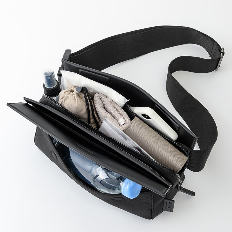前袋可容納一個 500 毫升的瓶子,內襯防水布料,防止其他物品灑落。磁吸式頂蓋下方設有拉鍊口袋和斜插口袋:斜插口袋可輕鬆存放手帕或手機,拉鍊口袋則可安全存放貴重物品。智能收納,輕鬆有序。