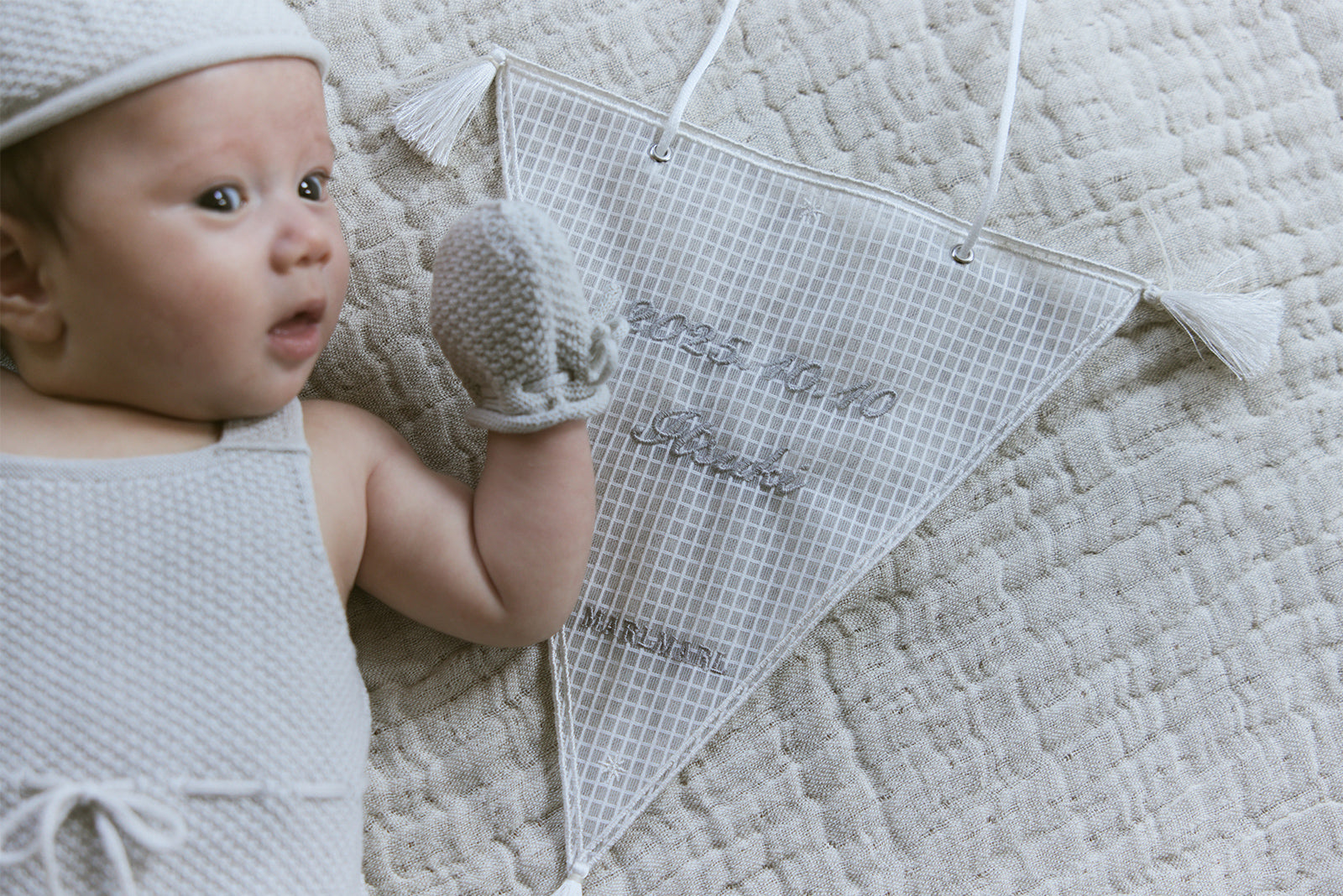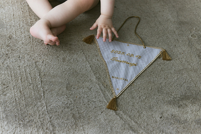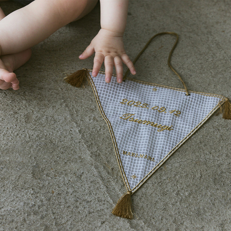 Celebrate your baby’s milestones with this striking anniversary tapestry—a timeless keepsake to showcase your little one’s journey. Crafted from sheer, grid-check fabric that captures light in a subtle glow, it features intricate gold embroidery for an elegant, daring touch. Personalize it with your baby’s name and special dates, making it a standout display alongside photos from 100-day celebrations or first birthdays. Perfect for gifting with matching embroidered bibs or towels, this tapestry creates a bold statement of love and memory that connects family near and far.