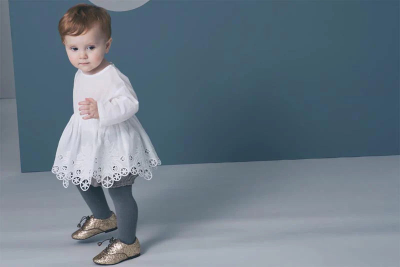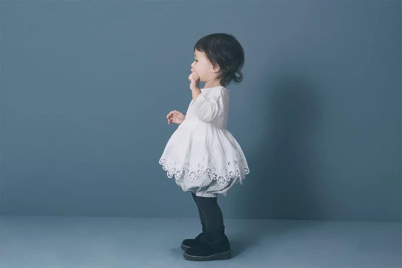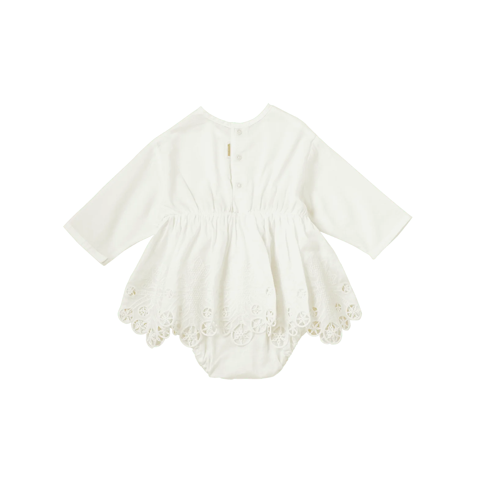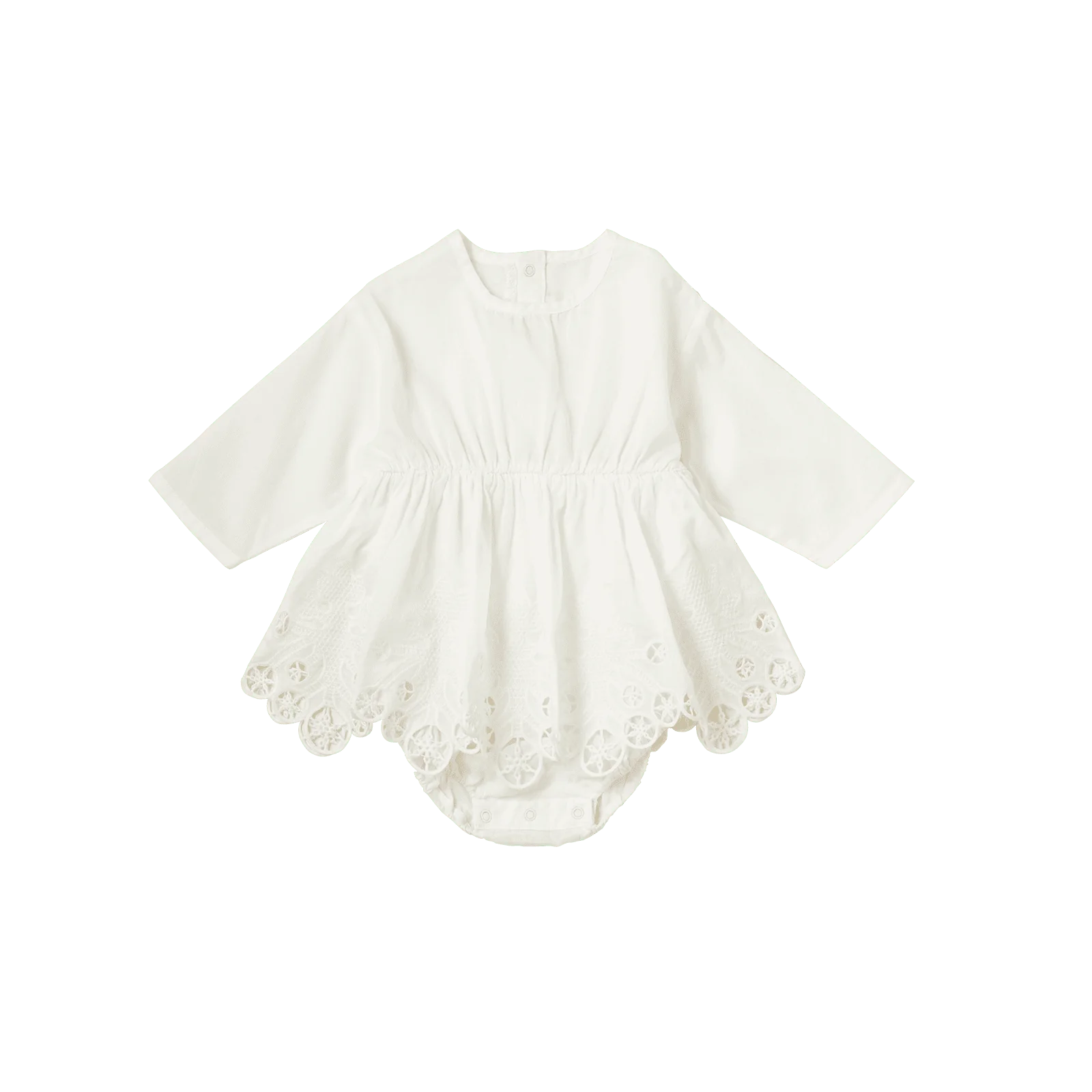 這款白色蕾絲包屁衣採用浪漫束腰設計,搭配奢華扇形花邊,展現優雅且的風格。