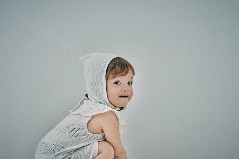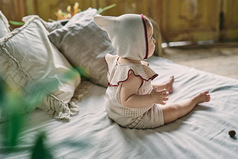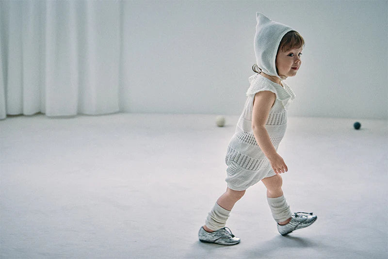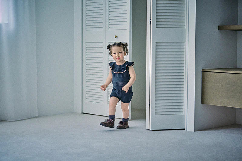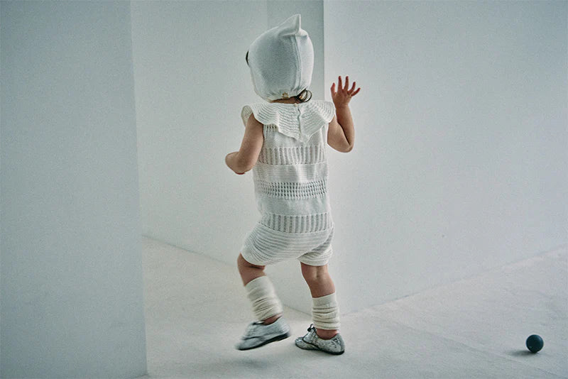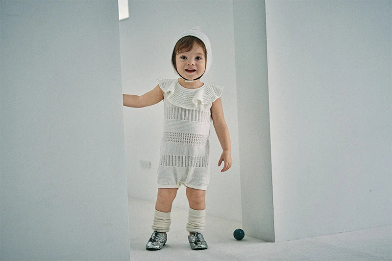 甜美的荷葉邊領口增添獨特魅力,圓形剪裁輕柔包覆尿布區,後頸小開衩更添優雅感。