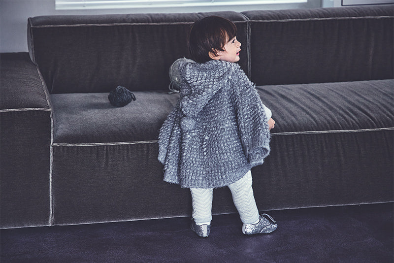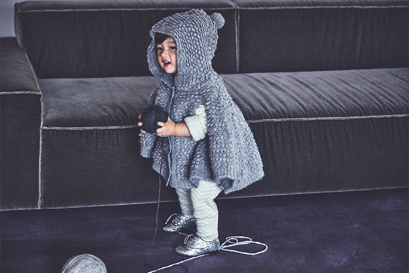 這款斗篷不僅適合嬰兒,還能穿到3歲左右。寶寶能坐起來的時候,可以像柔軟的毯子一樣蓋在身上;等寶寶會走路了,就可以當外套穿。它也很百搭,可以和其他衣服搭配。小寶寶可以把手伸進前面的開口裡,大一點的寶寶可以把手伸進下擺。這樣既能牽著手又能保暖,真是個很棒的設計。