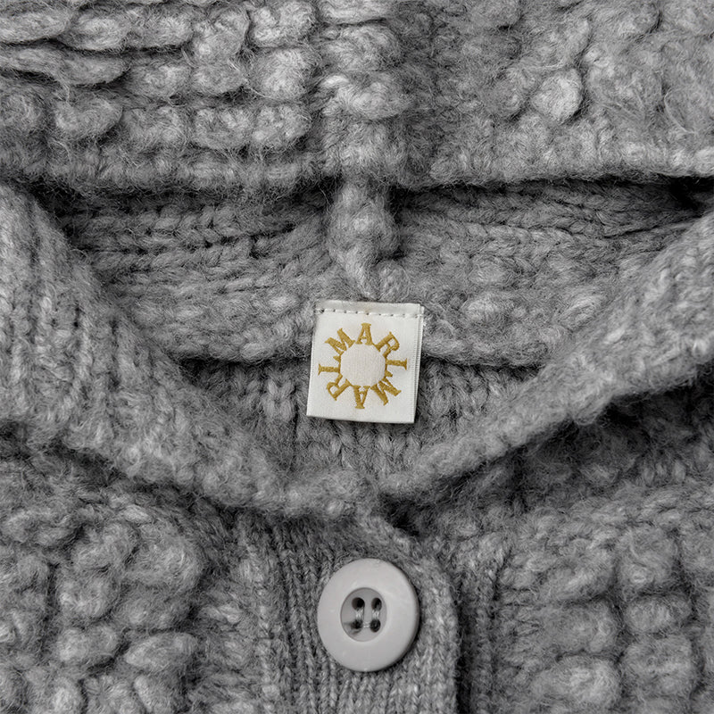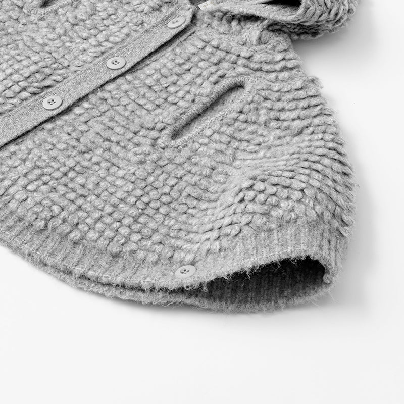針織布料採用厚實柔軟的環狀紗線製成,打造出蓬鬆飽滿的造型。有絨球的帽子讓臉頰放鬆,更顯上鏡。