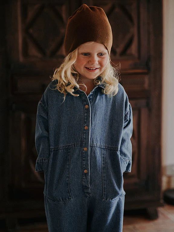 Made from our incredible lightweight vintage style denim, with a stylish collar and deep pockets in the front and the back, this unique and edgy denim boiler suit is tailor-made for real adventures and storing all the treasures your child discovers along the way.